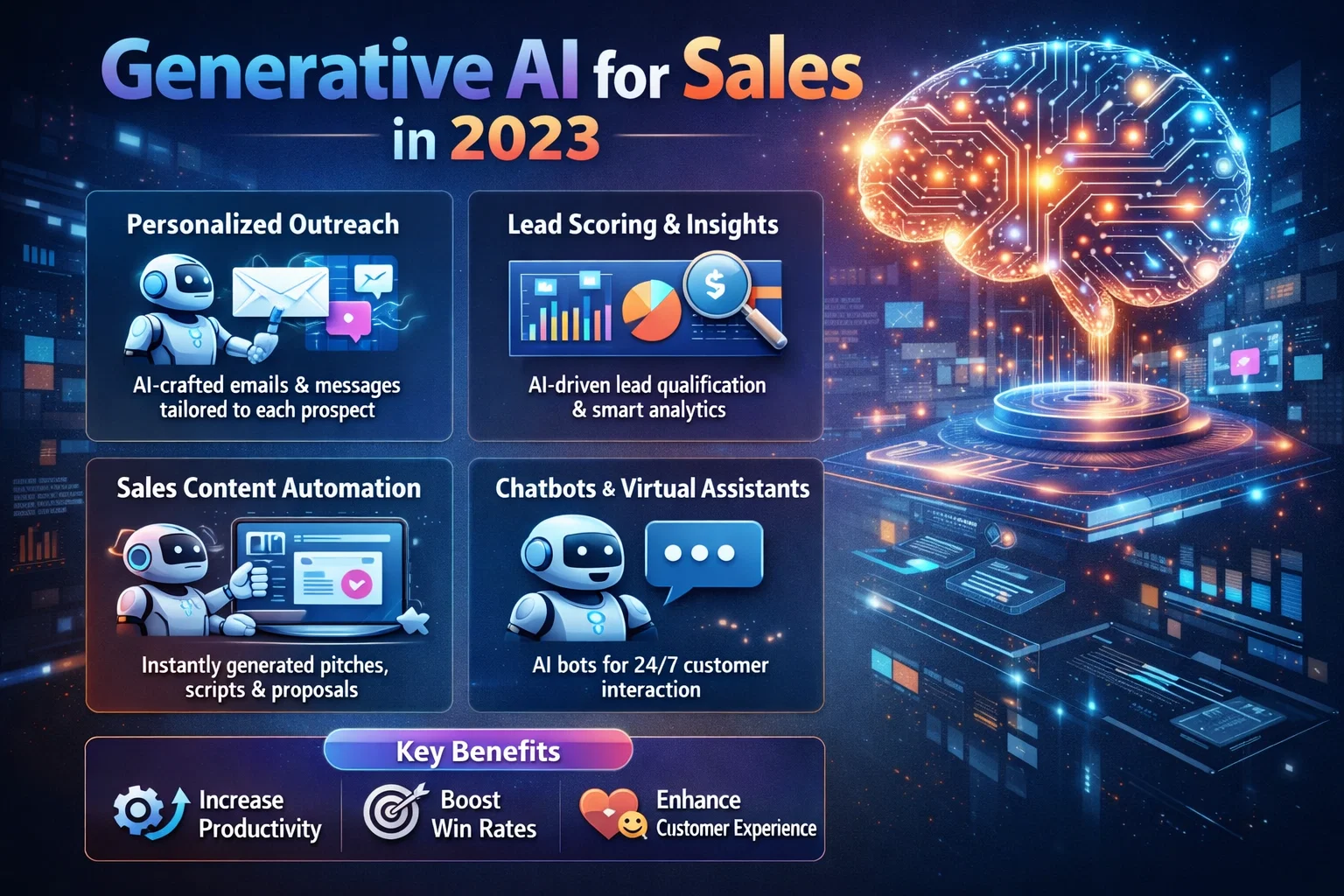 One of the biggest benefits of Generative AI is in sales. It has the ability to automate repetitive tasks. For example, salespeople often spend a lot of time creating proposals, email templates, and other sales materials. Generative AI can generate these materials quickly and efficiently. This allows the sales person to have valuable time to focus on other aspects of their job, such as building relationships with customers.
